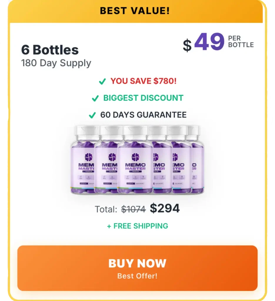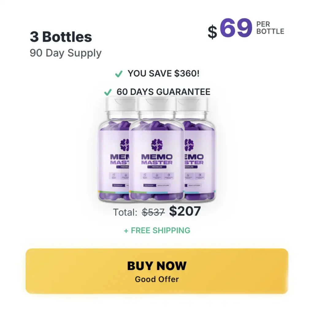Most users choose the multi-bottle packages to secure the best savings and maintain consistent results over time. Don’t wait until memory lapses or brain fog hold you back—take action today and give your mind the nourishment it deserves with Memo Master.